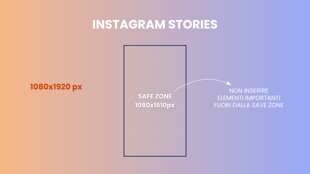 Per ottenere il massimo risultato visivo, è sempre consigliabile progettare le stories direttamente in formato verticale, tenendo conto delle aree di sicurezza: elementi come testi o call to action non dovrebbero trovarsi troppo in alto o troppo in basso, per evitare che vengano coperti da username, pulsanti o interfacce dell’app.