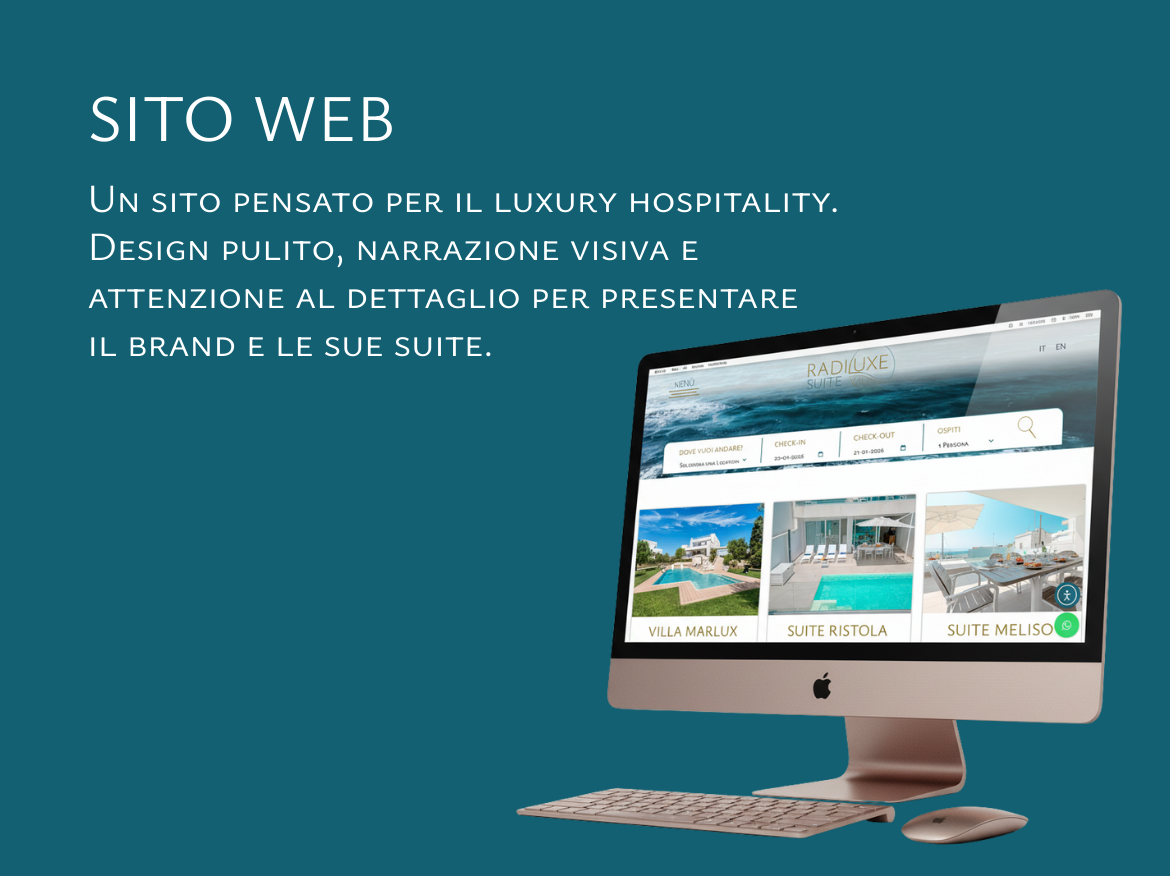 Il progetto ha poi preso forma digitale con lo sviluppo del sito web radiluxesuite.com, concepito come vetrina strategica del brand: uno spazio elegante, fluido e orientato alla valorizzazione delle singole suite, in linea con il posizionamento luxury.