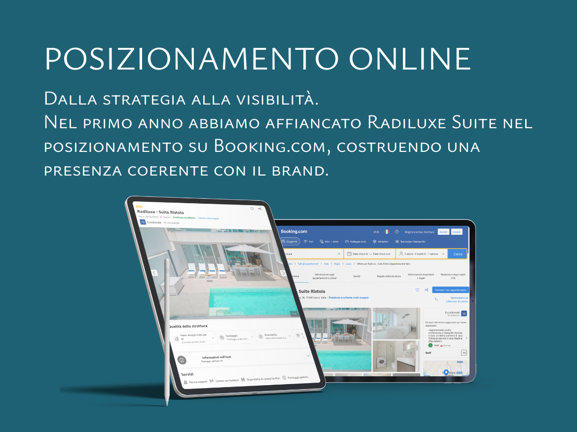 Nel primo anno, Parrotto Web Solution ha inoltre affiancato Radiluxe Suite nel posizionamento delle due ville su Booking.com, curando immagine, coerenza comunicativa e presenza strategica sulla piattaforma.
