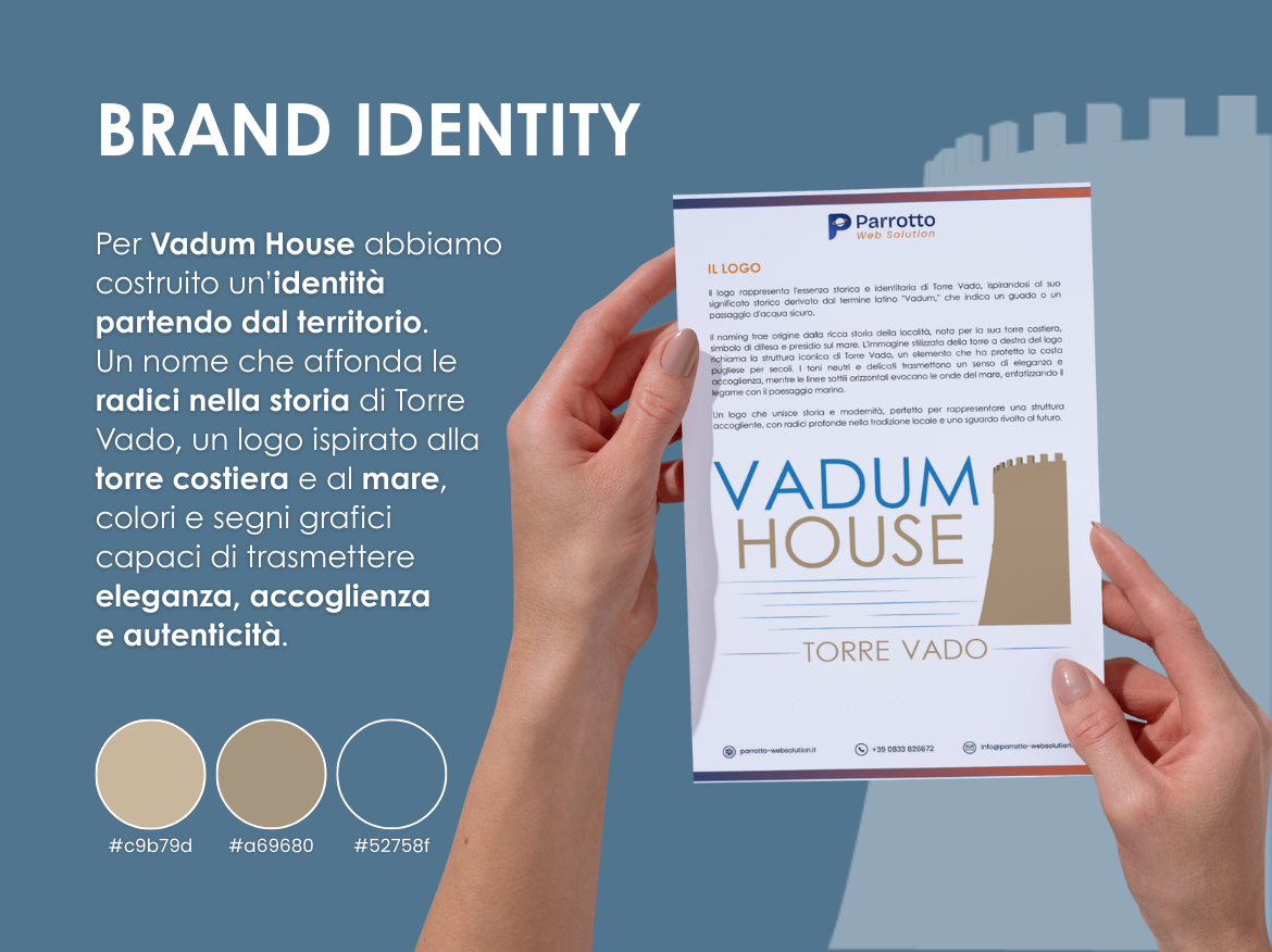 Il primo passo è stato costruire un’identità solida e riconoscibile. Abbiamo lavorato sul naming, dando vita a Vadum House, un nome che affonda le sue radici nella storia del territorio. “Vadum”, dal latino, indica un passaggio sicuro, un guado: un riferimento culturale che dialoga con l’anima autentica di Torre Vado e con la sua torre costiera, simbolo di protezione e accoglienza.