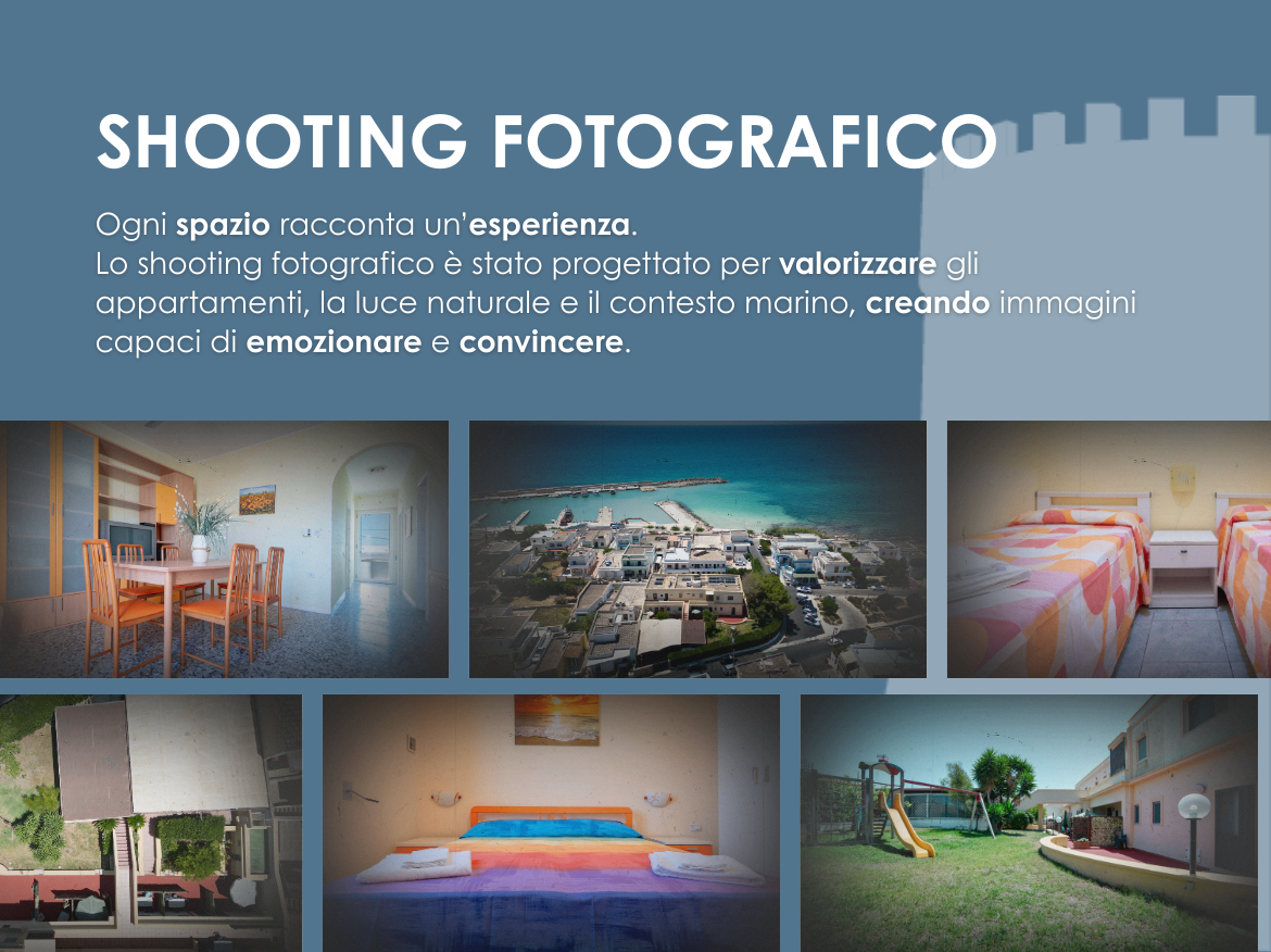 A completamento dell’identità, abbiamo realizzato uno shooting fotografico dell’intero complesso. Le immagini sono state progettate per valorizzare gli spazi, la luce e il contesto marino, diventando uno strumento strategico per la comunicazione digitale e per la conversione.