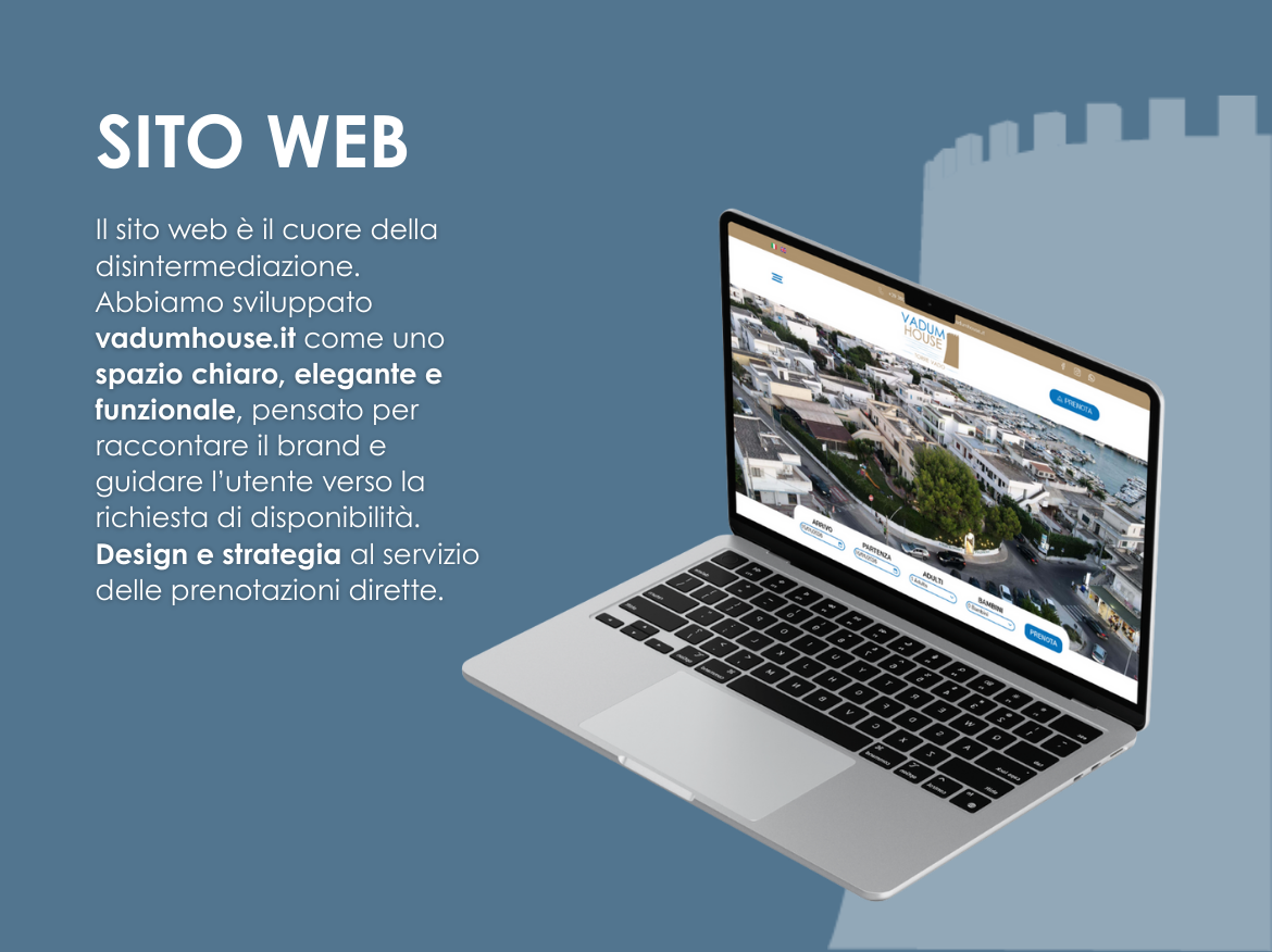 Il progetto ha poi preso forma online con lo sviluppo del sito web vadumhouse.it, concepito come fulcro della strategia di disintermediazione. Un sito pensato per raccontare il brand, trasmettere affidabilità e guidare l’utente verso la richiesta di disponibilità in modo semplice e intuitivo.